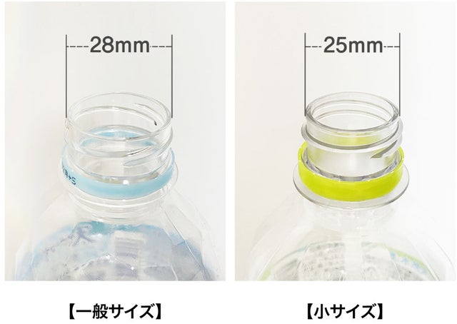 今回、口径サイズを2種類用意しており(口径2.7cm / 2.5cm)国内のペットボトルの口径は28mmが主流ですが、わずかに小さいもの、大きいものもあります。