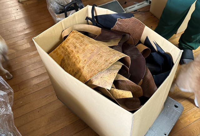 工房に届いた端材は一つ一つ時間をかけて選定していきます。選び抜いた端材を縫い合わせて1枚の革をつくり、それから裁断をしてようやく縫製が始まります。1枚の革から作るよりも10倍以上の時間とコストもかかりますが、パッチワークにこだわっています。