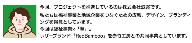 昔から障がい者支援に携わろうと考え、挑戦したこともあったがその時は達成できなかった。今回、RedBambooと革工房torogiがタッグを組んだプロジェクトを開始することができた。福祉的支援という形で社会に貢献するという願いを達成したい。