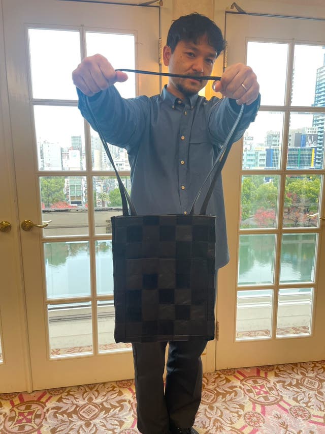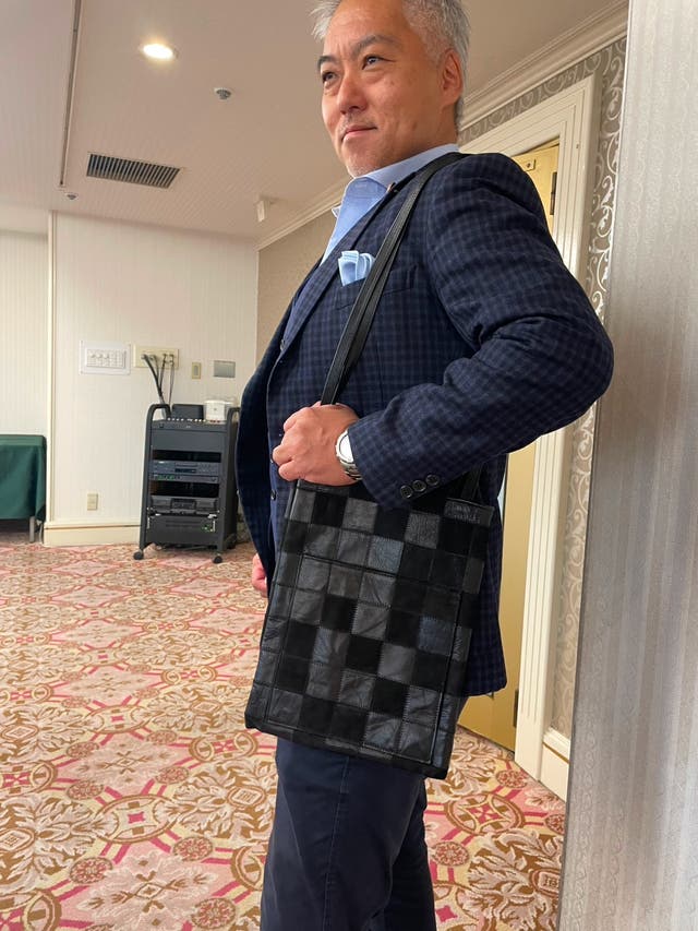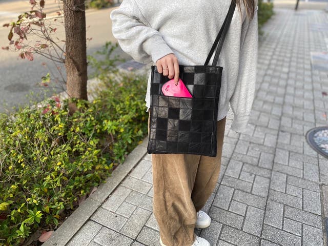 皆さん、こんにちは。私たちは兵庫県にある革工房・RedBamboo(赤竹工房)です。今回ご紹介するのは、サステイナブルな素材を使用した、世界に一つだけのパッチワークトートバッグです。このバッグは、ポーチにもなるミニバッグとして使える他、バッグインバッグとしても便利にお使いいただけます。