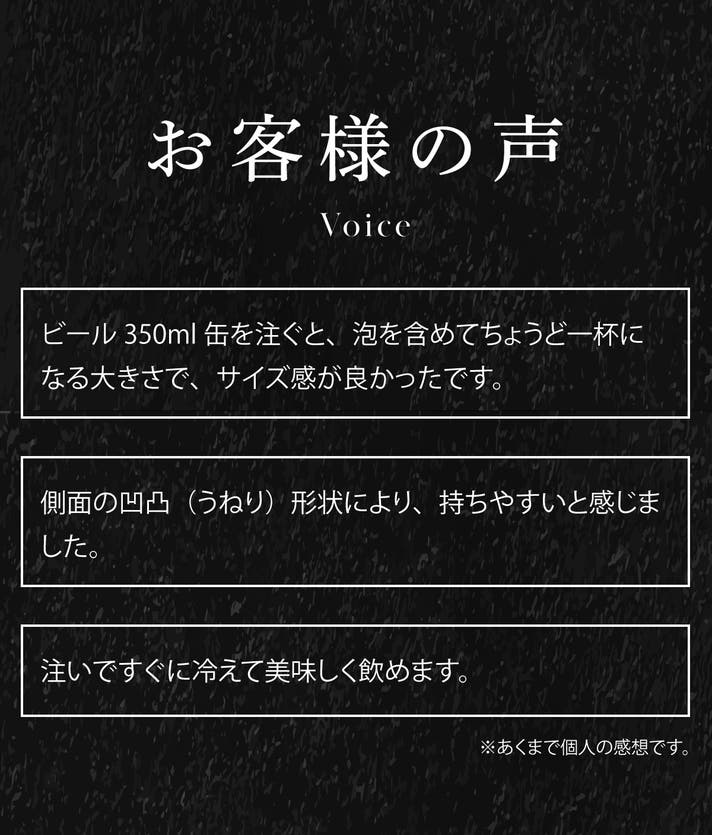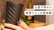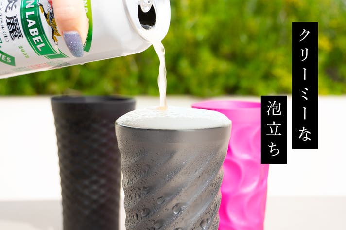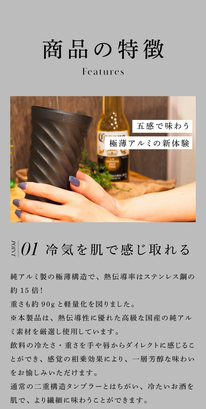 また、タンブラーの内側には微細凹凸加工を施すことでビールを注いだ時のクリーミーな泡立ちも愉しむことができます。手に取っていただく方の所有欲を満たし、冷たい飲み物をダイレクトに感じていただける、「新感覚のタンブラーを多くの方に知ってもらいたい」、その一心で製作いたしました。