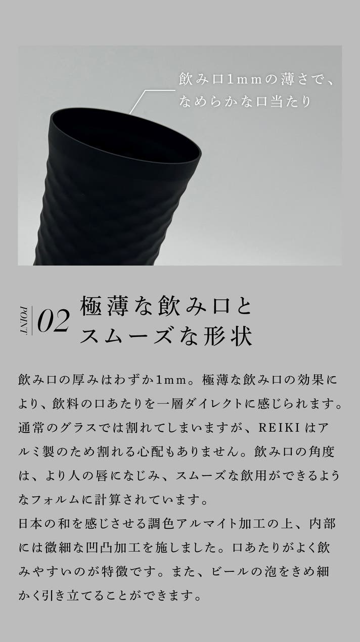 REIKIの材質には飲み物の冷たさをダイレクトに感じられるよう、アルミニウムを採用しています。 アルミニウムは熱伝導率が高いので冷たさが伝播しやすいです。