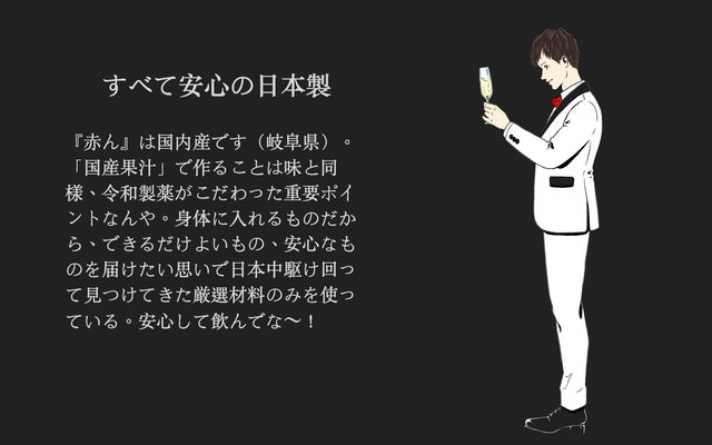 『赤ん』のコンセプトが誕生したのは、令和製薬の社長である私「望之助」がアメリカから来日し、会社員として働いていた2017年の大阪。気のおけない仲間たちと飲み会をしていた際、友人が楽しい時間で、お酒を控えているのを目にしたときでした。