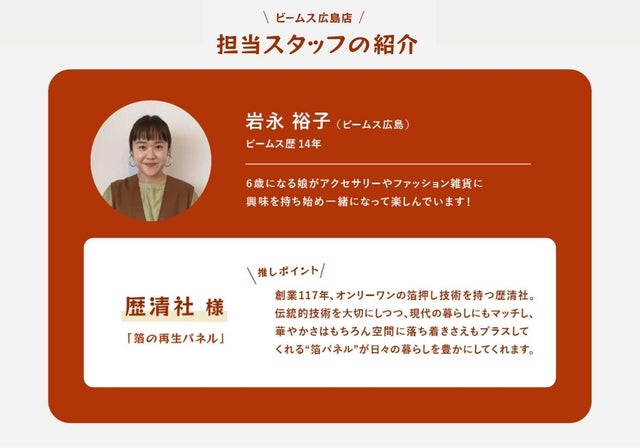 岩永さんは昨年家を建てられ、インテリアに興味が湧いていたところ、ビームス 広島が携わるローカル共創プログラムに参加した歴清社の担当に抜擢。持ち前のセンスや感性を活かし、箔パネルのデザイン開発に貢献頂く。「箔なんて何だか敷居が高くて、私には到底似合わない素材だと思っていましたが、こんなモダンで素敵なデザインがあるなんて驚きました。ぜひ我が家にも1枚飾ります!」と岩永さん。