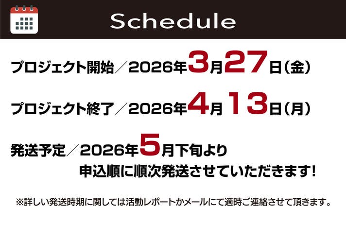 プロジェクト終了後お申し込み順に、順次に発送させていただきます。