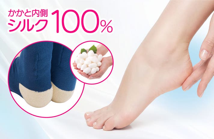 - かかと部分は贅沢シルク100%。乾燥しやすいかかとを包み込んでやさしく保護!