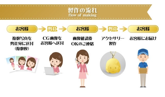 写真を送付→CG画像を送付→OKが出次第制作→お客様にお届け(約2~3週間前後)