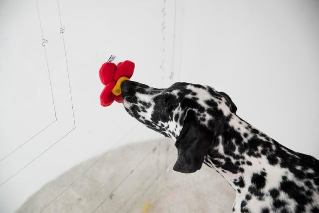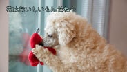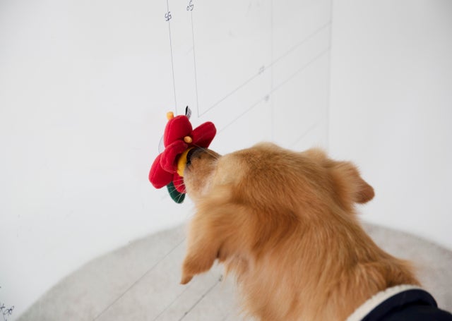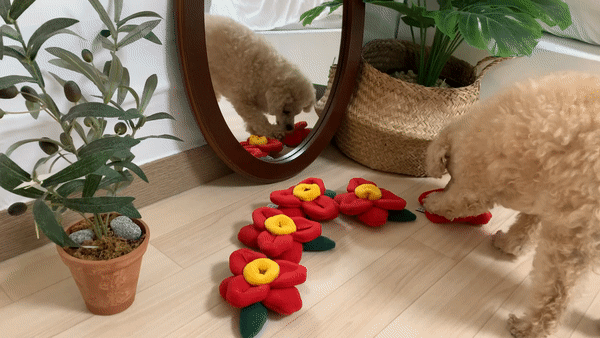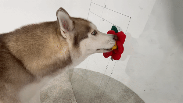 まるでわんちゃんが花を食べてるように見えませんか。一般的なノーズワークおもちゃはほとんどマットやボールタイプでしたがこのツバキの花のノーズワークおもちゃは違います。