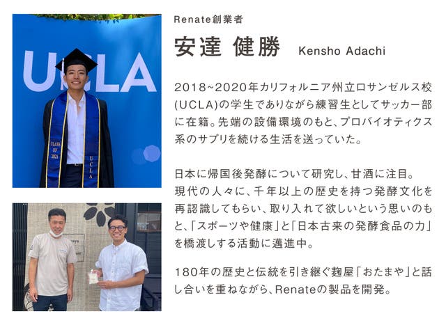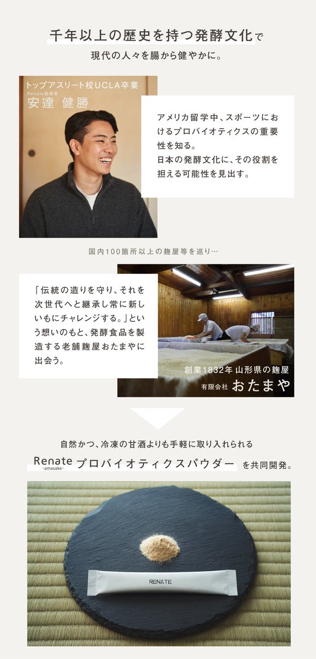 さらに、アスリートや現代の生活者にとっても摂取しやすい甘酒のかたちを探求していたところ、甘酒をパウダーにする技術を持つ麹屋「おたまや」さんと出会い、Renateプロバイオティクスパウダーが実現しました。