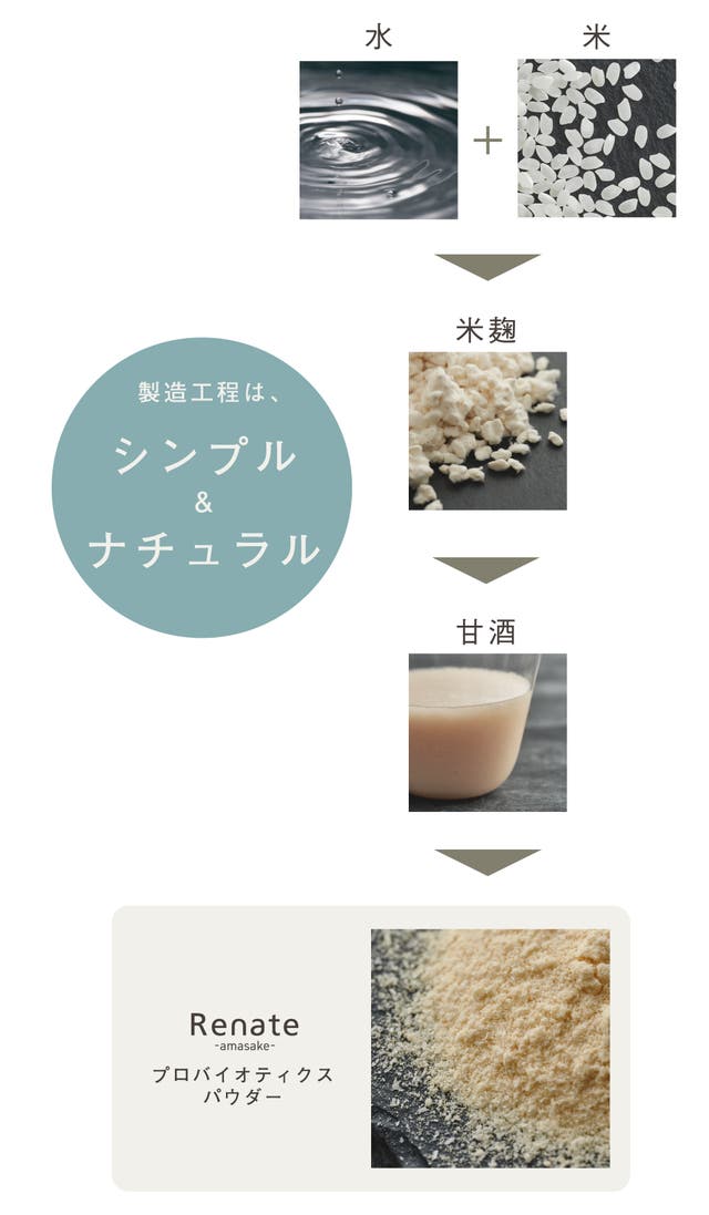 Renateプロバイオティクスパウダーに使用している甘酒は、水・米・麹で作られたものになり、無添加の米麹を使用しています。