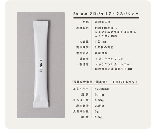 Renateプロバイオティクスパウダーは、180年の歴史と伝統を引き継ぐ麹屋で、麹菌を長時間発酵・低温乾燥し作られています。