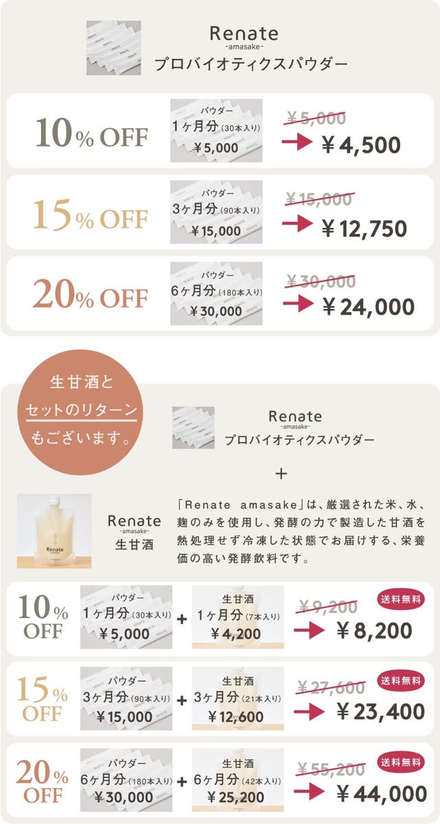 Renateプロバイオティクスパウダー x 180本 [一般販売価格 30000円 の20%OFF] + Renate生甘酒 42本【一般価格 25200円 の2800円OFF 】送料無料、税込み価格 44000円