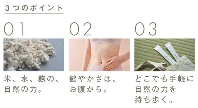- 米・水・麹のみで造られた、自然の力を日常で気軽に補給