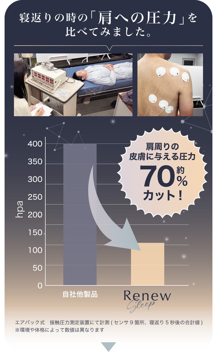 複数の生地を組み合わせ、身体を立体的に包み込む特殊なデザインで、寝返り時に肩にかかる圧力を大幅に軽減させ、スムーズな寝返りを可能にしました。