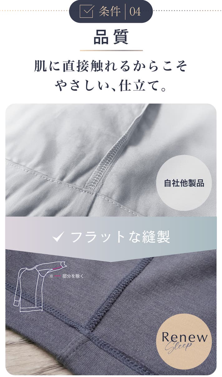 私たちは「ねむりのプロ」として素材へのこだわりはもちろん、スムーズな入眠を促し、意識のない睡眠中の動きをより快適にできる機能性パジャマを作りたいという想いで企画をスタートさせました。