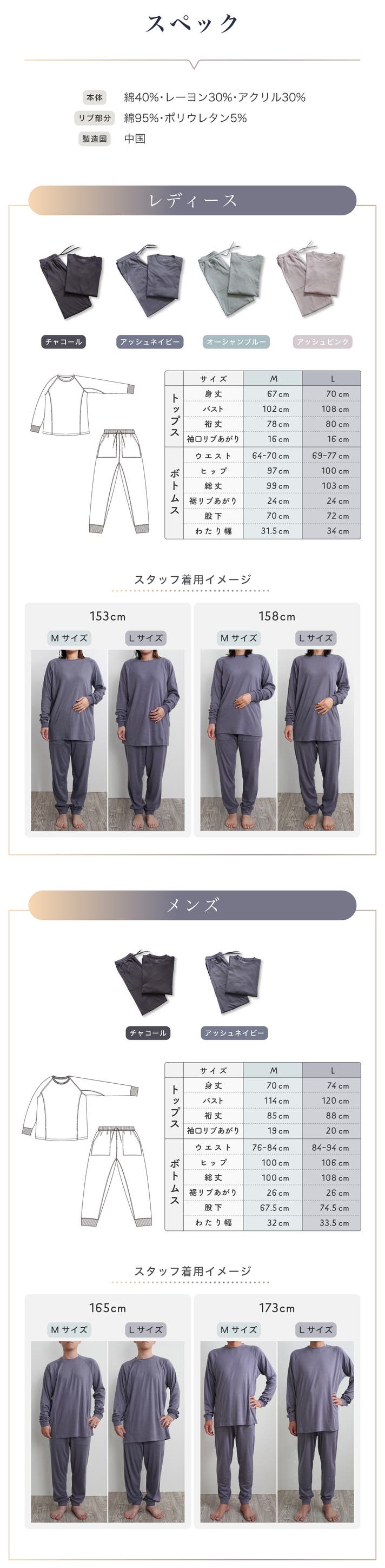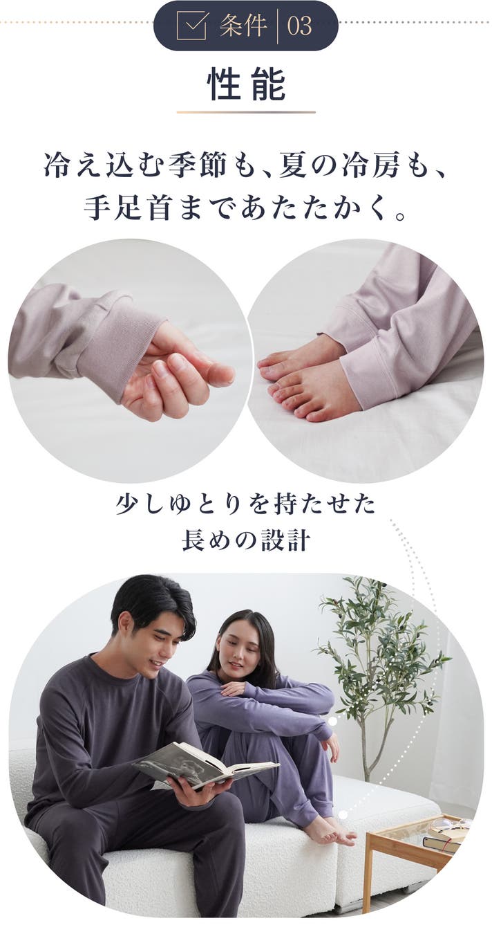 袖・ボトムスに少しゆとりを持たせた長めの設計 にしていることで、手先・足先回りの冷えを軽減。
