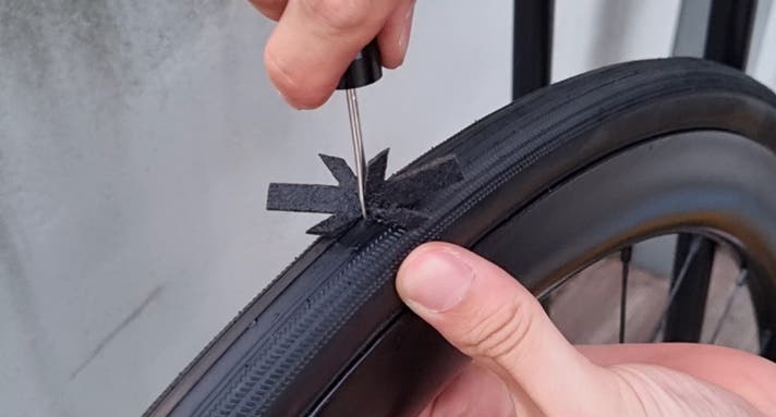 A:このリペアプラグには、さまざまな種類のシーラントと反応するように設計された成分が含まれています。この反応によって水分や化学物質が放出されるため、修理中に泡が出ることがあります。走行しながら乾いた地面で押しつけることで、プラグ内部の成分が乾燥・固化し、シーラントとの反応も安定して、より確実な補修が進みます。
