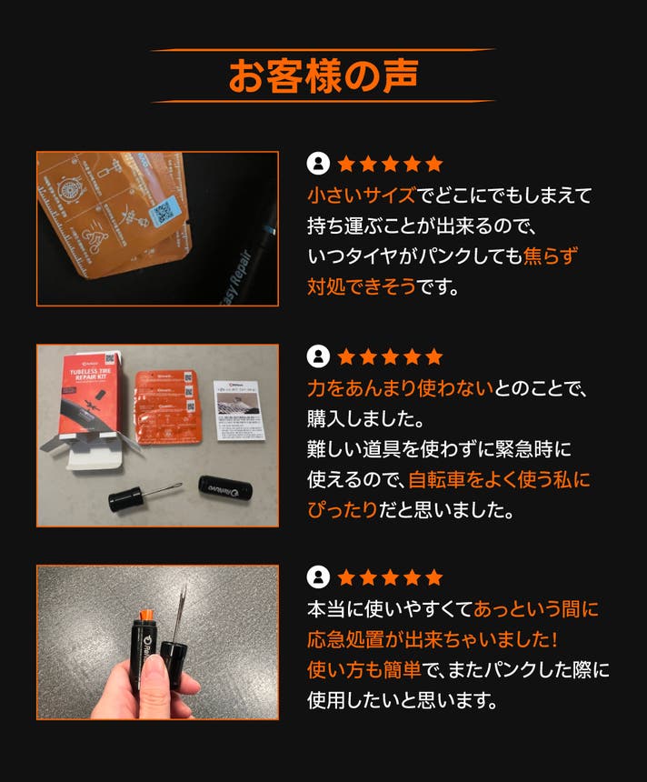 - 初めてでも使いやすいシンプルな構造!走行中のパンクに備えておける、差し込むだけの応急修理ツール