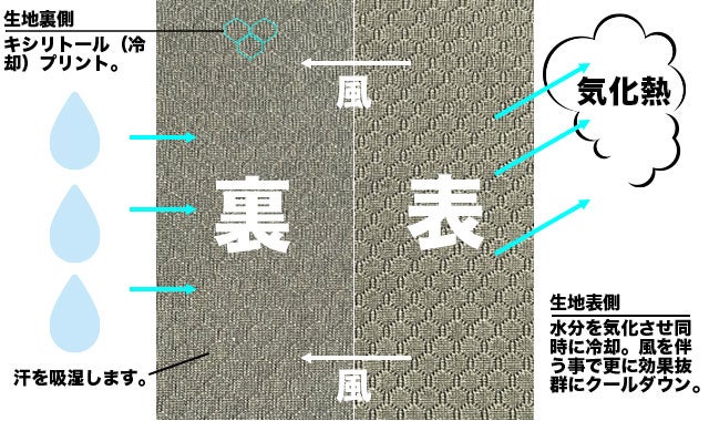 生地の裏に特殊キシリトール(冷却)加工を施されています。キシリトール成分は吸熱作用を持ち、汗や水分に反応。更に風を伴うと気化熱化現象が促進され、生地が冷やされ、クールダウン効果があります。
