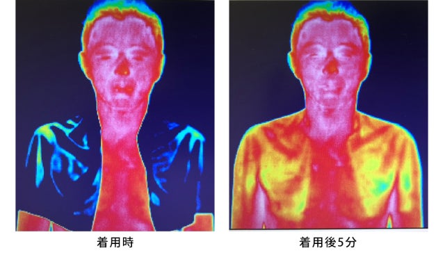 素肌にサンシェードと同じ生地のタオルをかけ、着用5分後にタオルを取ると、生地との接触部分は約3~5℃クールダウン。