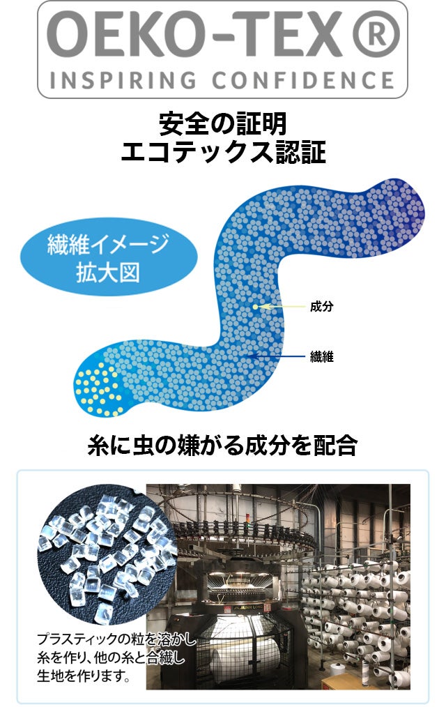 ※虫が苦手な成分が練り込まれた生地で身体を物理的に虫からガードしているという意味であり、はえ、蚊、蚤、その他これらに類する生物の防除を目的とした商品ではありません。無味無臭の成分を使用。