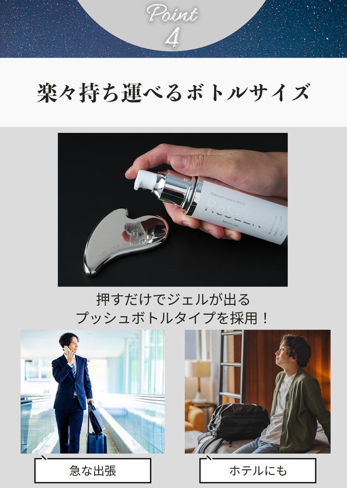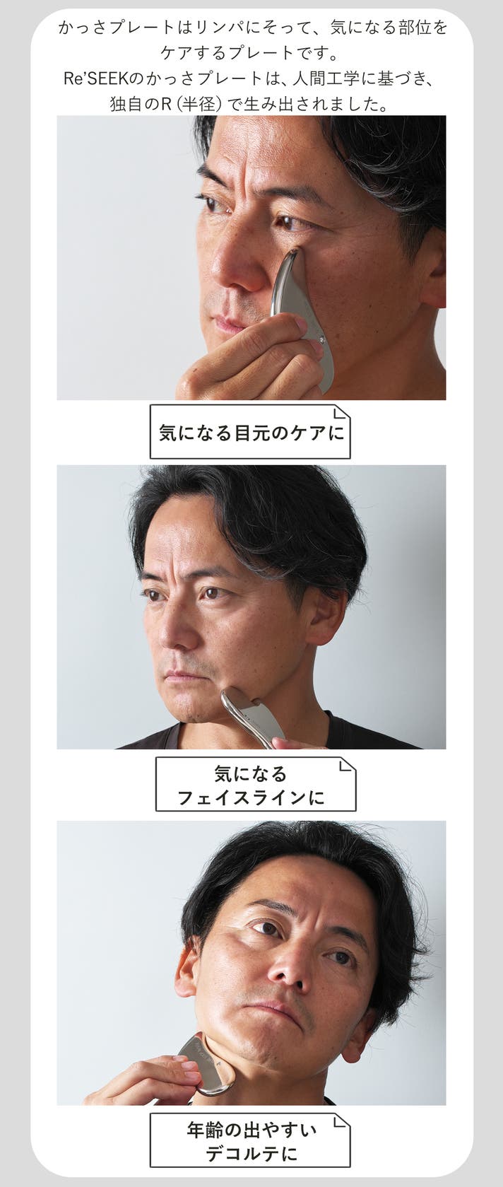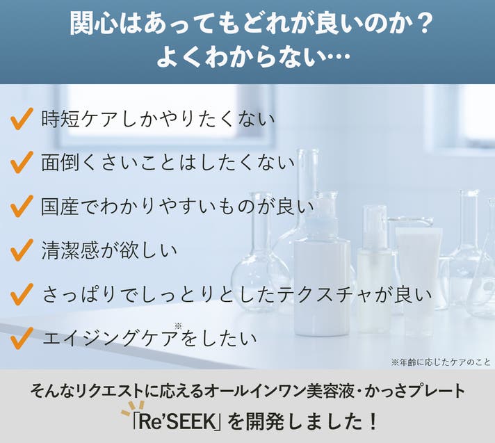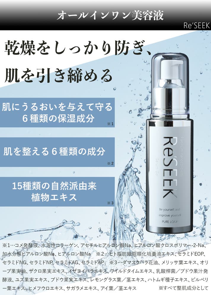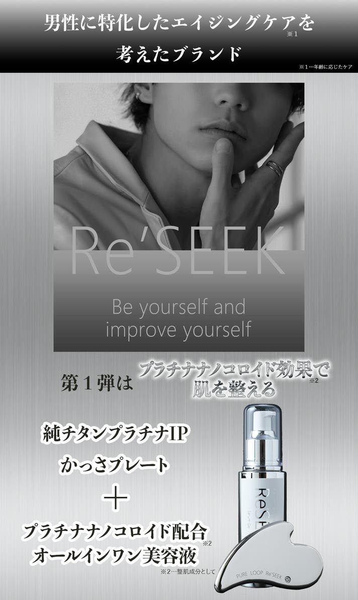 男性に特化したエイジングケア(※年齢に応じたケア)を考えたブランド「Re'SEEK」からの、プラチナナノコロイド(※整肌成分として)効果で、肌を整えることが期待できる、「オールインワン美容液と純チタンかっさプレート」のチャレンジです。