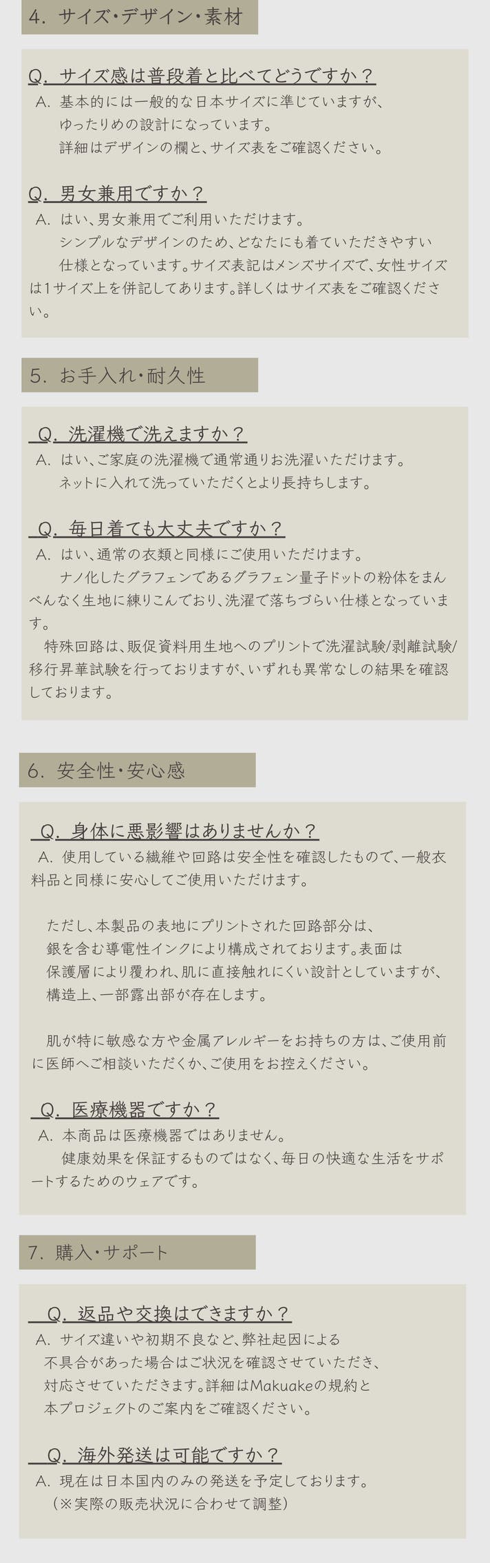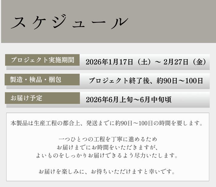【サポーター様へお願い】 Makuakeにご登録いただいた配送情報(ご住所)を必ずご確認下さい。 出荷後お届けできない場合がございます。再配送手配になる場合は配送料金がサポーター様のご負担になりますため、予めご確認いただきますよう、お願い申し上げます。 【配送遅延とキャンセルについて】 本文中に記載させていただいたスケジュールは、あくまでプロジェクト公開時点の予定です。 縫製工場の繁忙期の影響により、出荷時期が遅れる場合あり、また応援購入の性質上、配送遅延のおそれもございます。原則として、配送遅延に伴う応援購入のキャンセルはできませんが、リターン配送予定月から 3ヶ月 を超えた場合には、希望者に限りキャンセルにて対応させていただきます。 【商品等の不具合による返品・交換】 原則として、サポーター都合によるキャンセル・返金は承っておりません。 (サポーター都合のキャンセル不可の例:サイズが合わない、誤注文、長期不在) ◾️対応条件: 商品の初期不良、またはお届けした商品がご注文内容と異なる場合、 到着後14日以内にプロジェクトページの「実行者にメッセージ」よりご連絡ください。 状況を確認の上、返金対応、または良品との交換対応をさせていただきます。 ◾️返金額: リターン金額(税込)の全額 ◾️返品送料/再送料: 実行者負担 【返品・交換をお受けできない商品】 ・サポーターの責任により破損、汚損が生じた商品 ・商品のタグ、付属品、パッケージ(箱、袋など)を紛失、破棄された商品 ・事前にご連絡をいただいていない商品 ・商品到着後、15日以上経過した商品 【交換をお受けできないケース】 ・同一商品の在庫がない場合など、代替品をご用意できない商品 上記、あらかじめご了承いただきますよう、お願い申し上げます。