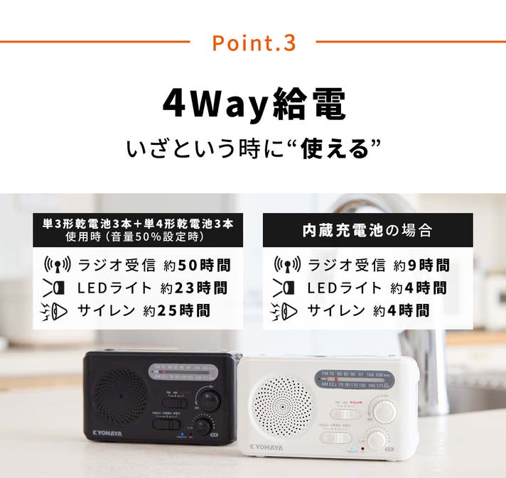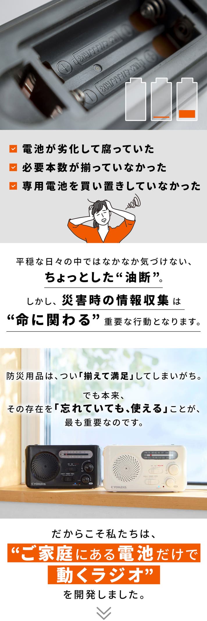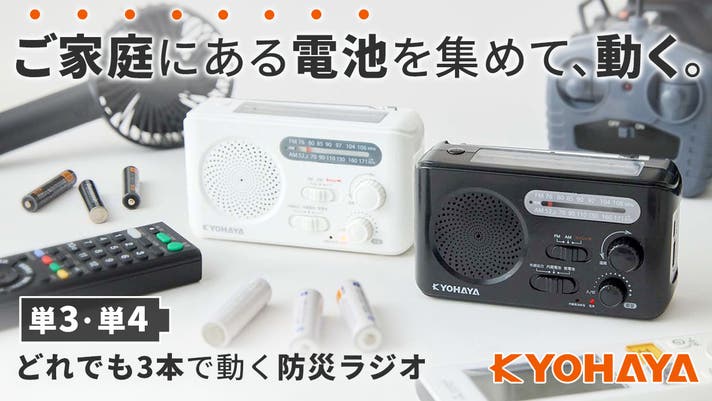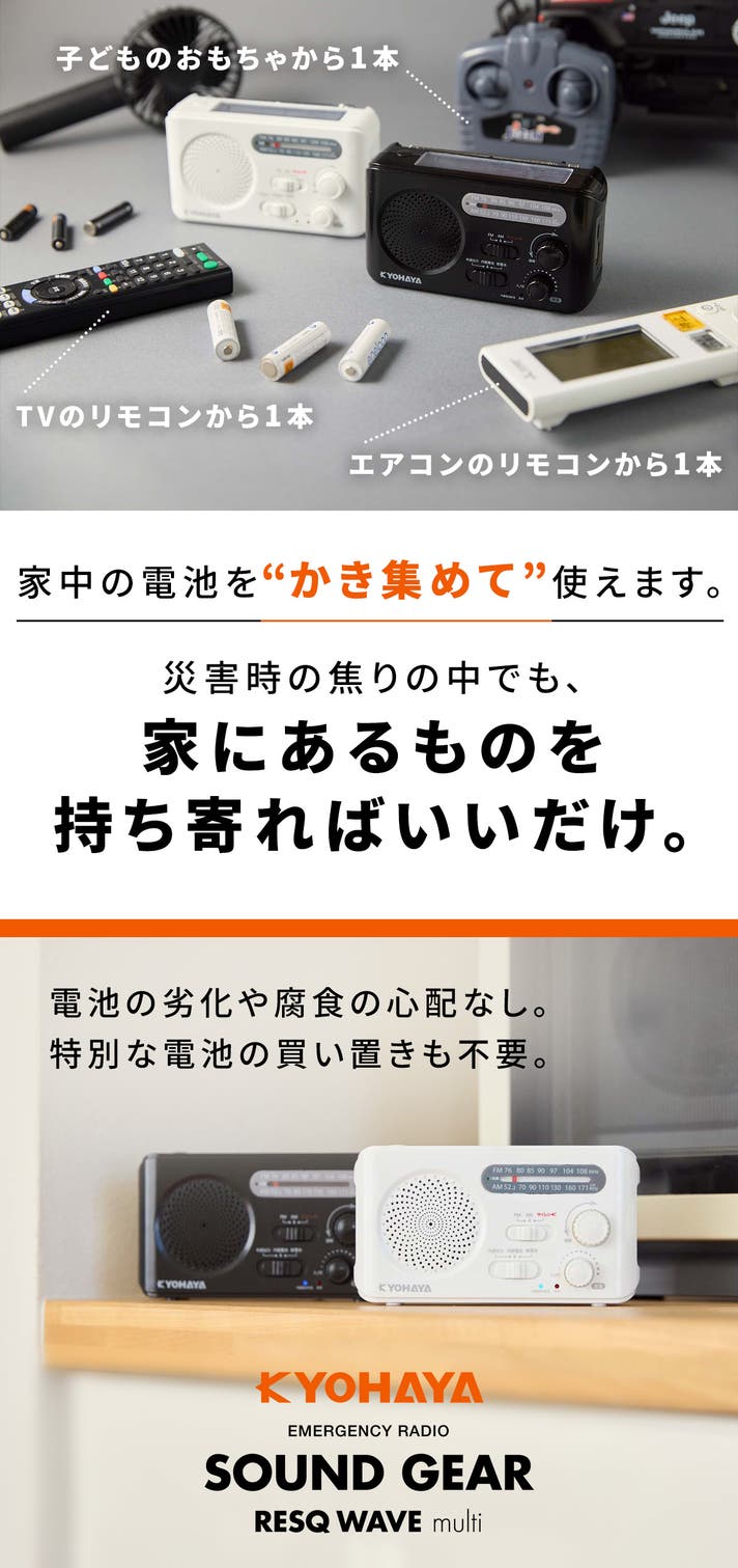 そんなケースを解消すべく、単3形・単4形の乾電池いずれか3本あれば使える防災ラジオ「KYOHAYA SOUND GEAR RESQ WAVE Multi」を開発しました。