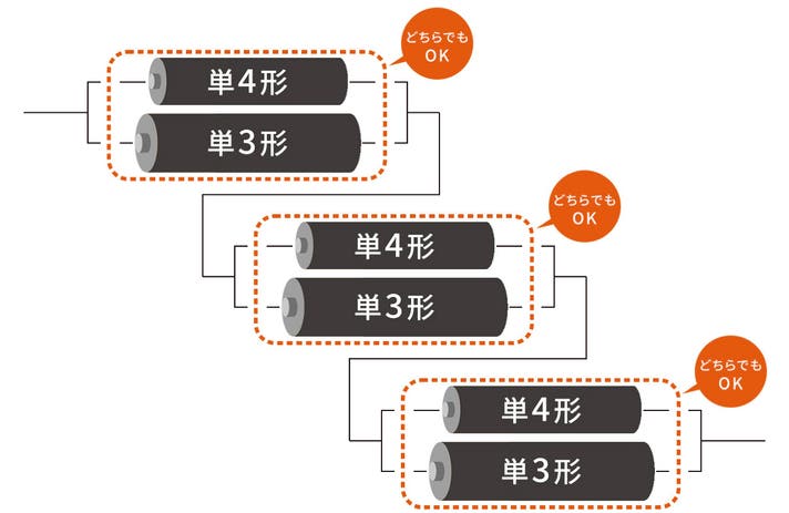 それぞれ単3形・単4形いずれかが入っていれば電気が流れる仕組みになっています。