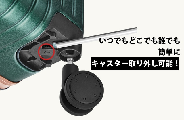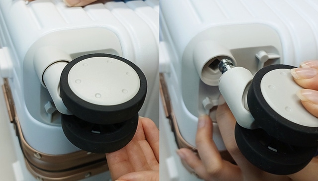 旅行時のキャスター破損や抜け落ちを防ぐため、バッグの内側からもう一度掴むモールドプレートを使って抜け落ちを未然に防ぎました。