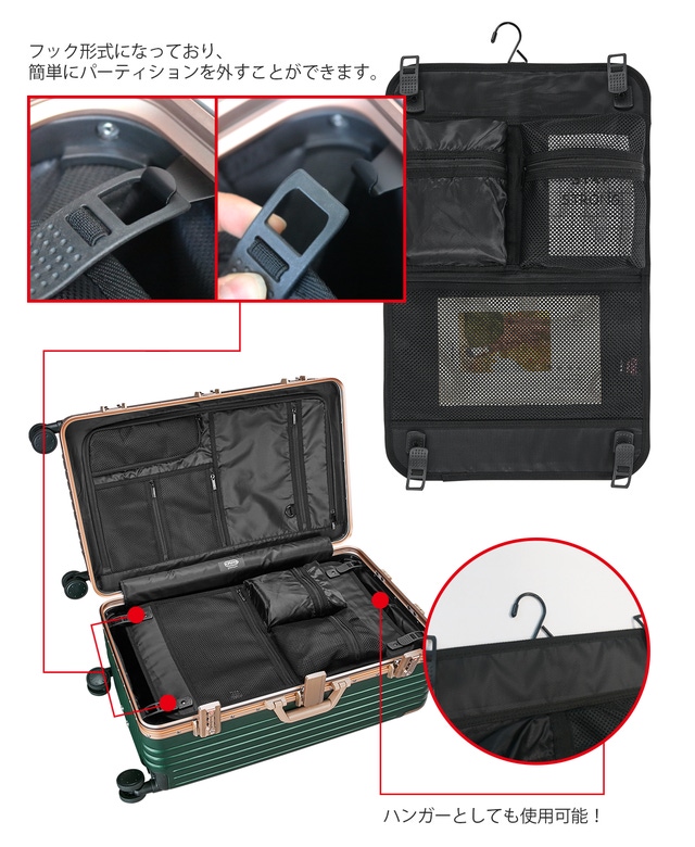 右側の収納スペースのパーティションは取り外し可能で、シャワー用のポーチやハンガーとしても使用できます。