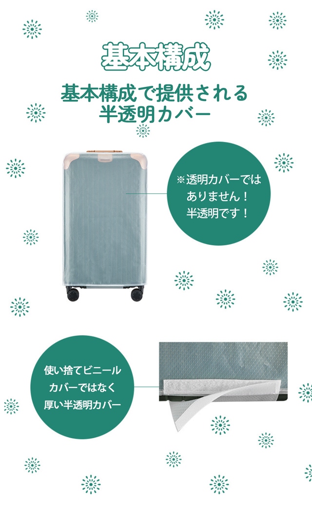 このスーツケース製品を購入してくださる方には、半透明のカバーが一緒に配送されます!