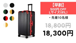 【早割・先着10名様】 RETOOのPC素材にアルミフレームを装着したLサイズ(81L)のスーツケース1点と、半透明カバーを提供!