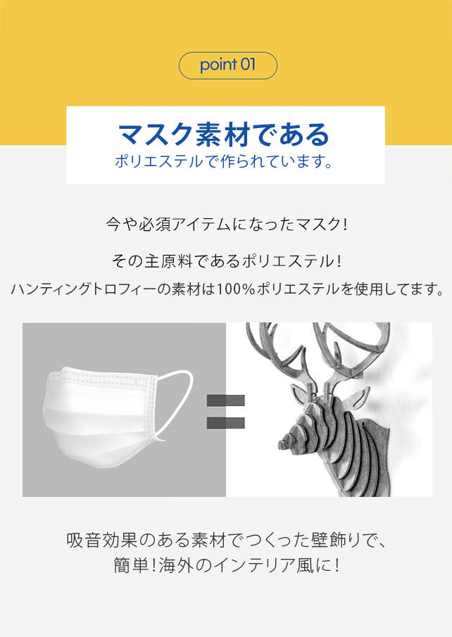 環境にやさしい「ポリエステル100%ボード」で作られていたB&B防音材でハンティングトロフィーを小学生でも簡単に組み立てられまるのが嬉しいです。