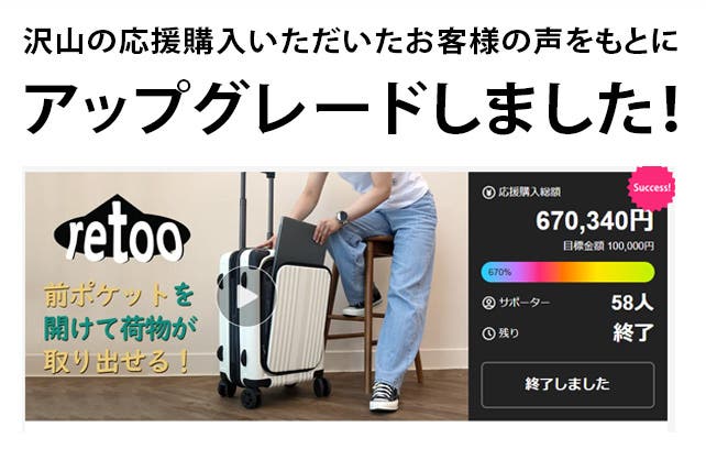 ※使用感等に関する返品・返金はお受けいたしかねます。 ※開発中の製品につきましては、デザイン・仕様が一部変更になる可能性もございます。 ※ご注文状況、使用部材の供給状況、製造工程上の都合等により出荷時期が遅れる場合があります。 ※OEM製品のため、他社様の類似品の販売を防ぐことができない可能性がある点、ご了承願います。 ※本プロジェクトを通して想定を上回る皆様から応援購入を頂き、現在進めている環境から量産体制を更に整えることができた場合、正規販売価格が販売予定価格より下がる可能性もございます。 ※原則として、配送遅延に伴う応援購入のキャンセルはできませんが、リターン配送予定月から1ヵ月を超えた場合には、希望者に限りキャンセルにて対応させていただきます。 Makuakeの性質上、以上の注意点につきましてあらかじめご理解とご了承いただいた上で応援購入くださいますよう、よろしくお願い申し上げます。 私たちはスーツケースを製作するために現在工場とプロジェクトを誠心誠意進めています。 しかし、開発中の工程においてデザイン、色が一部変更になる可能性もあります。 製造工程上の事情や配送作業による事情により配送に多少遅れる場合がございます。 上記のようにプロジェクトページに記載している内容に変更がある場合は、できるだけ早く活動レポート等で共有していく予定です。 応援よろしくお願いします。 ありがとうございます。