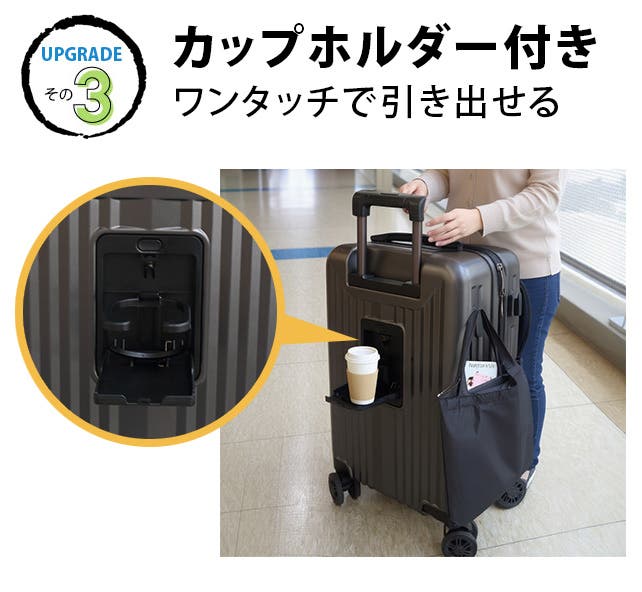 スーツケースの裏面に内蔵されていて、飲み物や傘を立てておくためのホルダーです。スーツケースに固定されているため、歩きながらでも飲み物がこぼれにくいです。