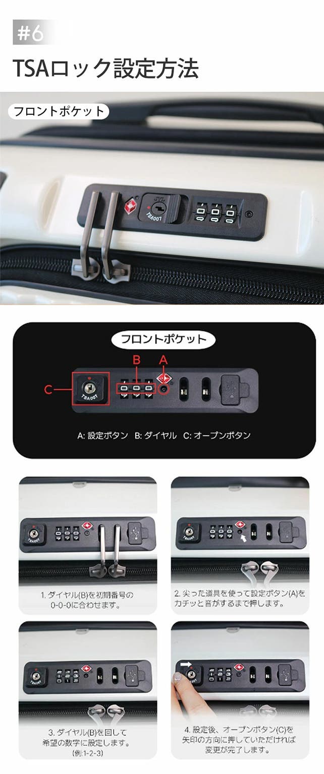 米国運輸保安庁(TSA)が許可した錠で、米国の出入国時に実施される保安点検の際、ロック機構に損傷なく検査を受けることが出来ます。