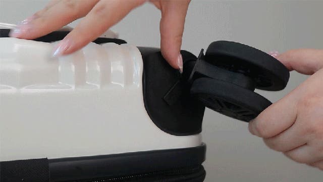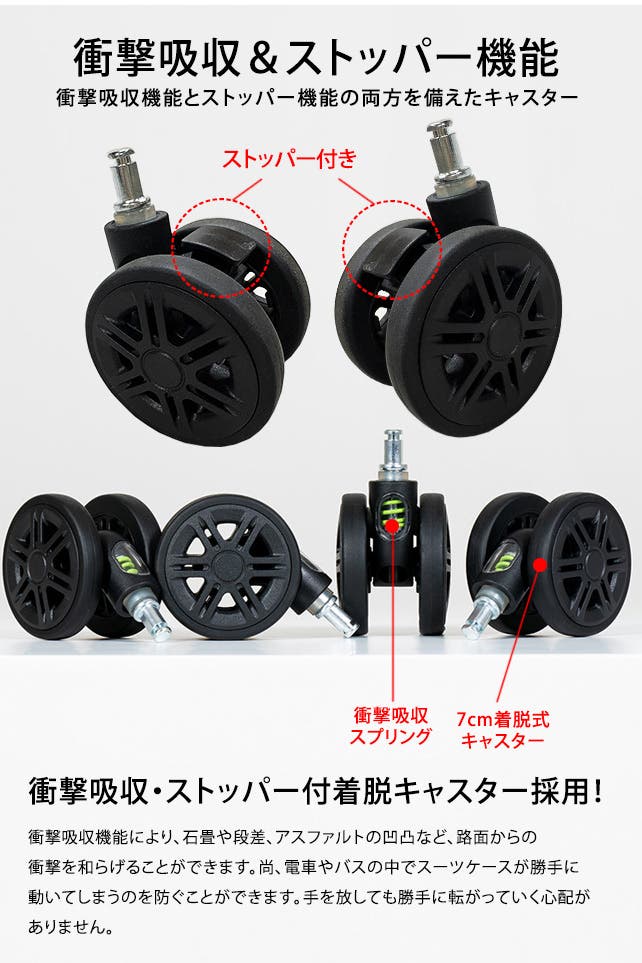 坂道や揺れる電車内でも、ストッパーをロックすればスーツケースが動かなくなり、両手が自由になります。また、簡単に取り外せるため、汚れた車輪を拭いたり、壊れた場合に自分で新しいものに交換したりすることが可能です。