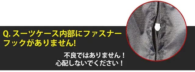 スーツケース内部のファスナーはフックがないか、ひっくり返った状態で装着されています。アフターサービス用のファスナーなので区別しておいたもので、これは正常です。