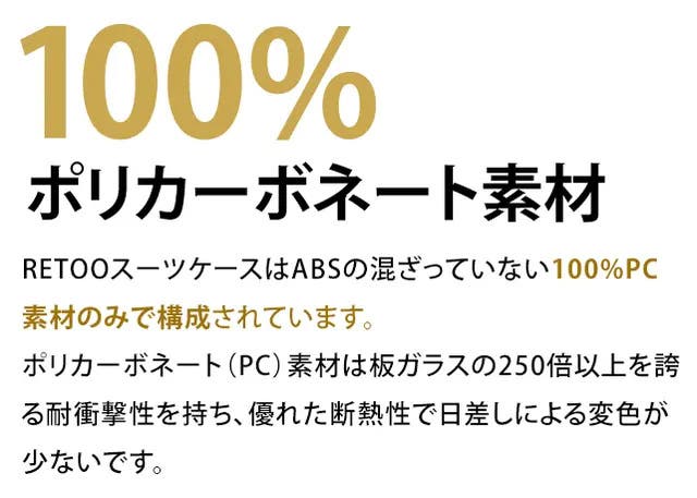 RETOOスーツケースはABSの混ざっていない100%PC材質で構成されています。