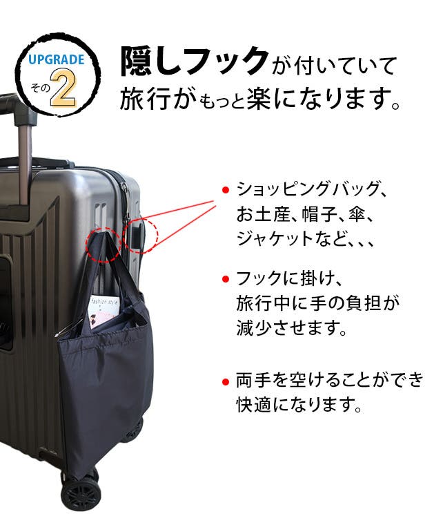 - 隠しフックが付いていてちょっとした荷物を掛けられて旅行が楽になります。