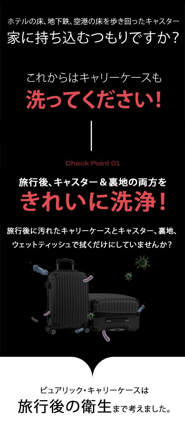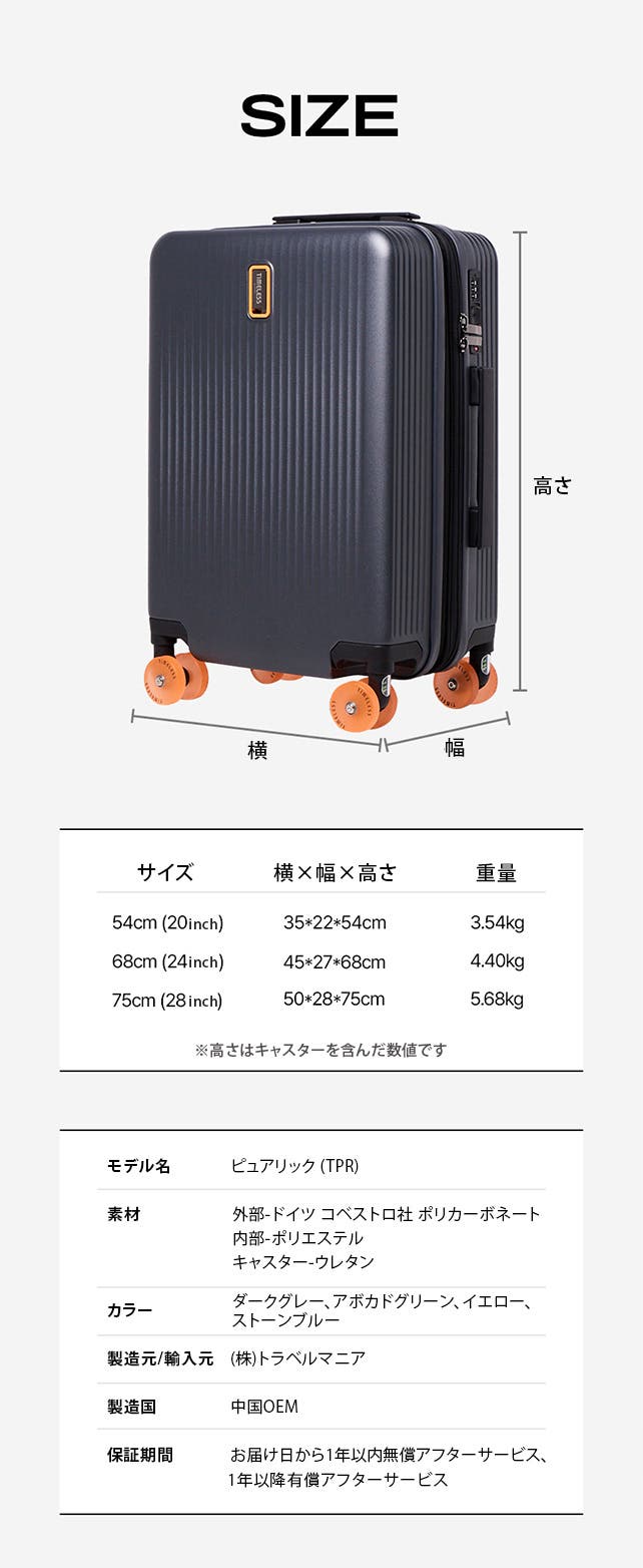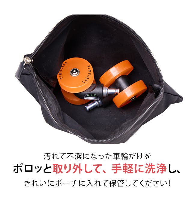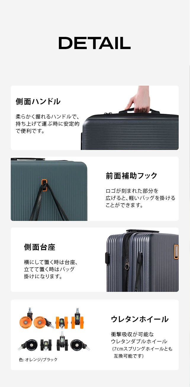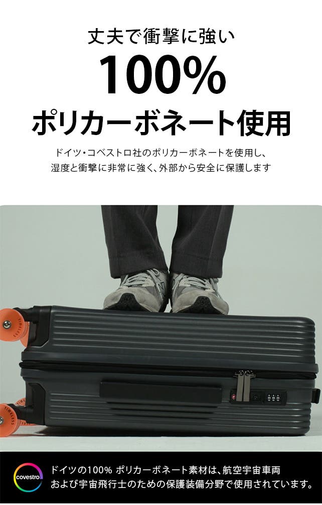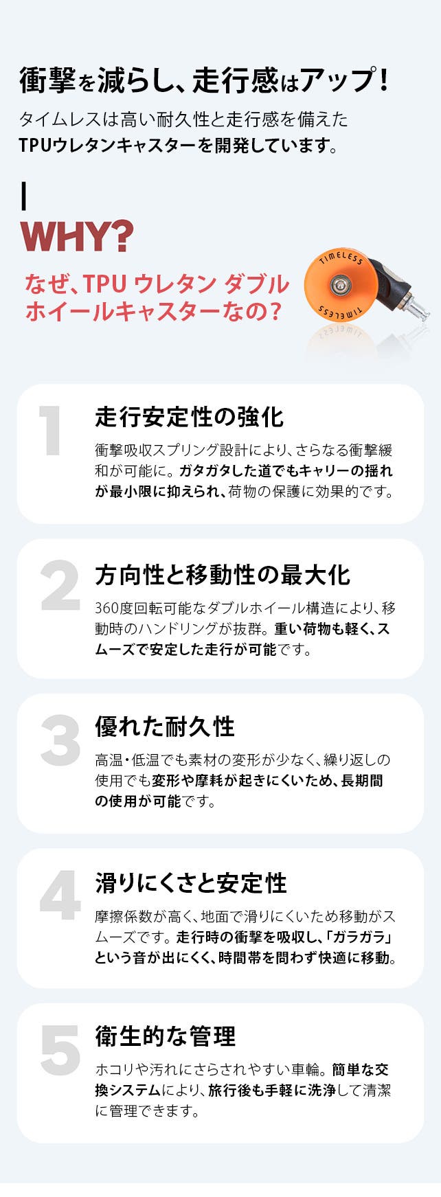 - ドイツのPC100%材質で割れにくく耐久性に優れた本体、衝撃吸収が可能なウレタンダブルホイール