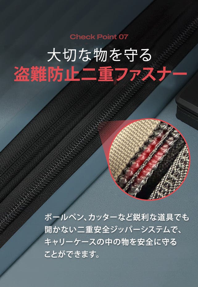 - TSAロックはもちろん、盗難防止機能付きの二重安全ファスナーで、セキュリティも二重にガード