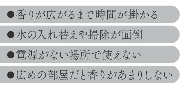 水の入れ替えや洗浄の手間がないため、忙しい日常でも気軽に香りのある暮らしを楽しめます。