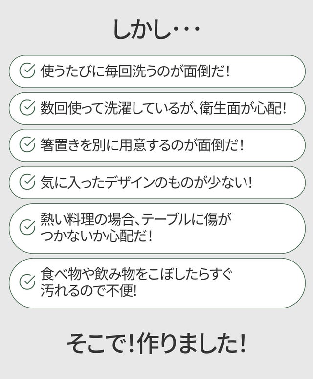マットに箸置きが付いていて、別途に箸置きを置く必要はありません。