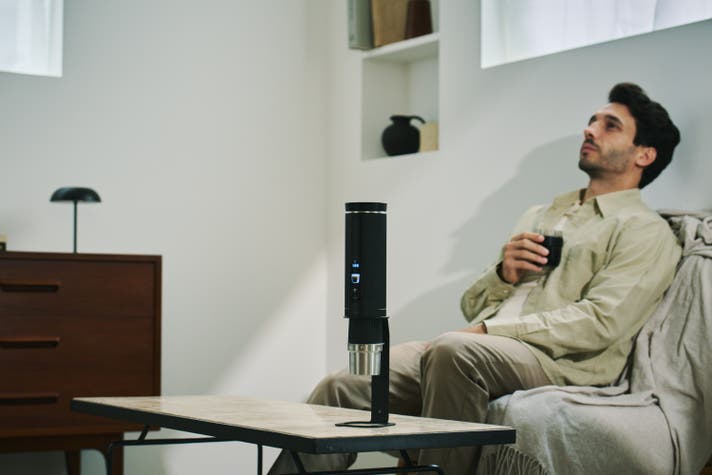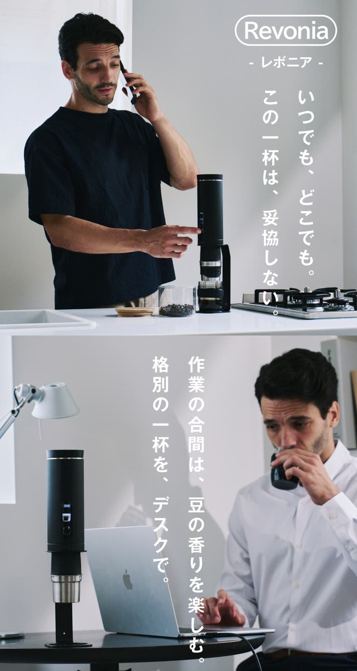 Revoniaは、スタイリッシュでスリムなので、どこでも好きな場所で、時間・手間を短縮し、ワンタッチでドリップコーヒーが楽しめる充電式全自動コーヒーメーカー。