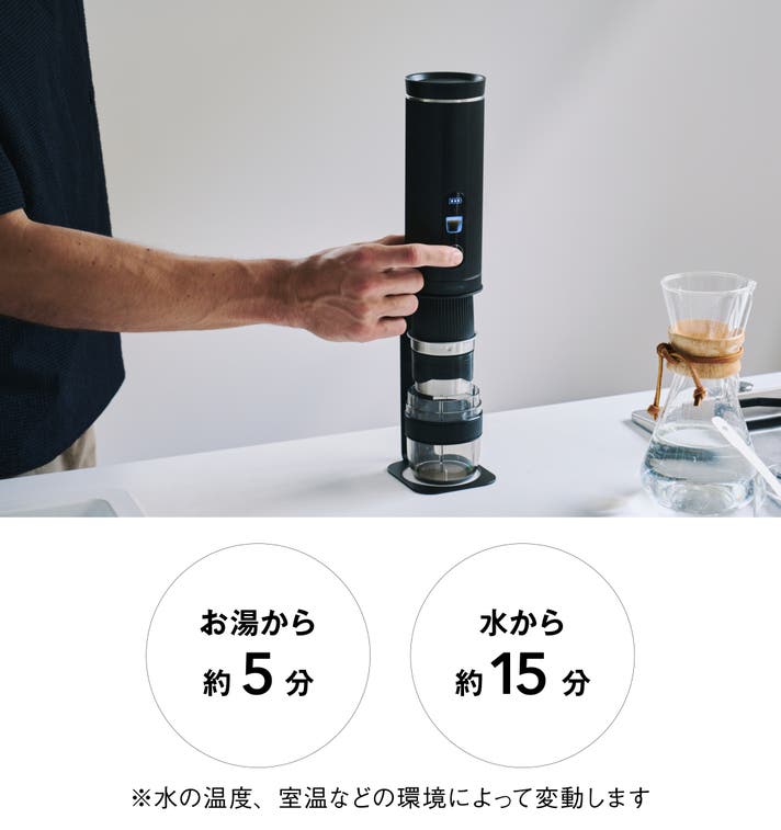 - 【水からでもOK】充電式&ポータブルなのにハイパワー。「低温ホールド抽出」で本格的な味わいを!