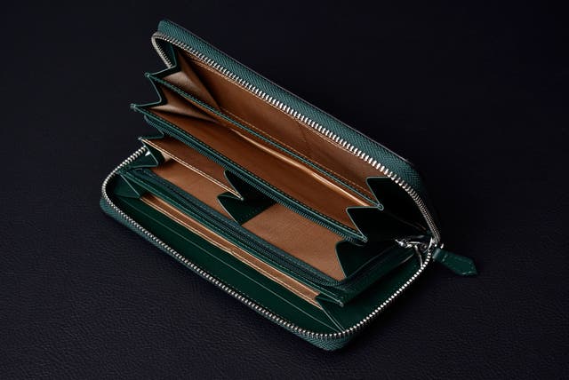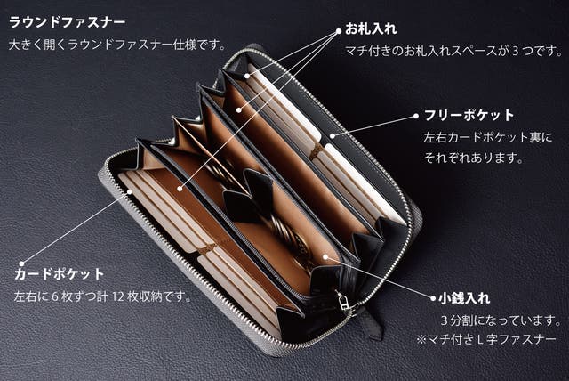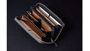 ラウンドファスナーの特徴を生かす為に、出来る限りマチ付き仕様としました。 小銭入れ部分もマチ付きL字ファスナーを採用することで大きく開く仕様となっています。これにより、全体的にも大きく開く事が出来るので、大変見やすく又使い勝手のいい仕様が 実現出来ました。