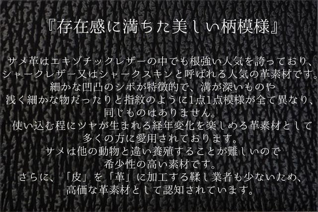 「シャークレザー」とは「サメ革」のことです。 今回使用しているのは宮城県気仙沼で捕れたヨシキリザメの皮を活用しています。