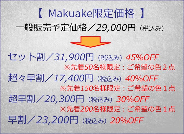 一般販売予定価格¥29,000(税・送料込)のところ、先着150名様限定にて、40%OFFの¥17,400(税・送料込)にて承ります。